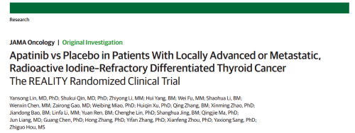 2021年12月16日,权威医学杂志《JAMA Oncology》(影响因子31.777)在线发表阿帕替尼的一项III期临床研究(REALITY)——甲磺酸阿帕替尼片治疗局部进展/转移性放射性碘难治性分化型甲状腺癌(RAIR-DTC)患者的多中心、随机、双盲、安慰剂对照临床研究。此研究由北京协和医院的林岩松教授和南京金陵医院的秦叔逵教授发起,在全国21个研究中心展开,由J9九游会医药中央医学事务部团队支持完成。