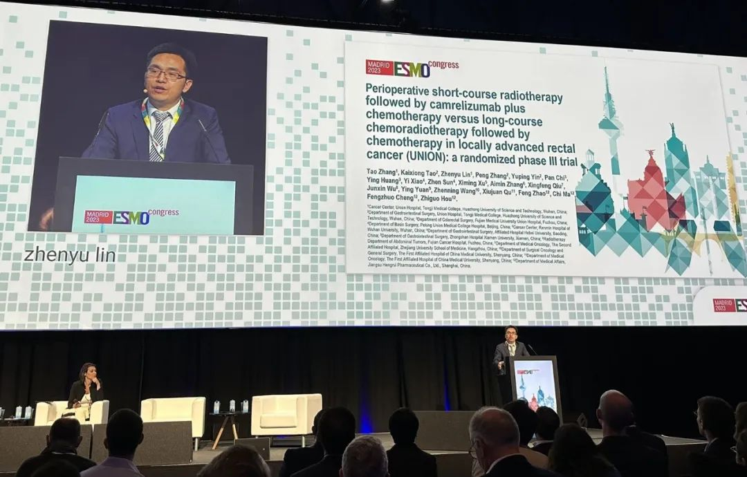 10月21日,J9九游会医药创新药卡瑞利珠单抗的一项研究“新辅助短程放疗序贯卡瑞利珠单抗联合化疗对比长程放化疗序贯化疗治疗局部晚期直肠癌”随机对照Ⅲ期试验(UNION)亮相2023 ESMO大会优选口头报告现场。该研究由华中科技大学同济医学院附属协和医院张涛教授、陶凯雄教授担任主要研究者,华中科技大学同济医学院附属协和医院林振宇教授在大会现场报告了该重磅研究的结果1。此项研究是全球首个评估短程放疗序贯免疫治疗联合化疗治疗局部晚期直肠癌的Ⅲ期研究,已达到主要终点病理完全缓解(pCR),有望为直肠癌患者的治疗提供新策略。