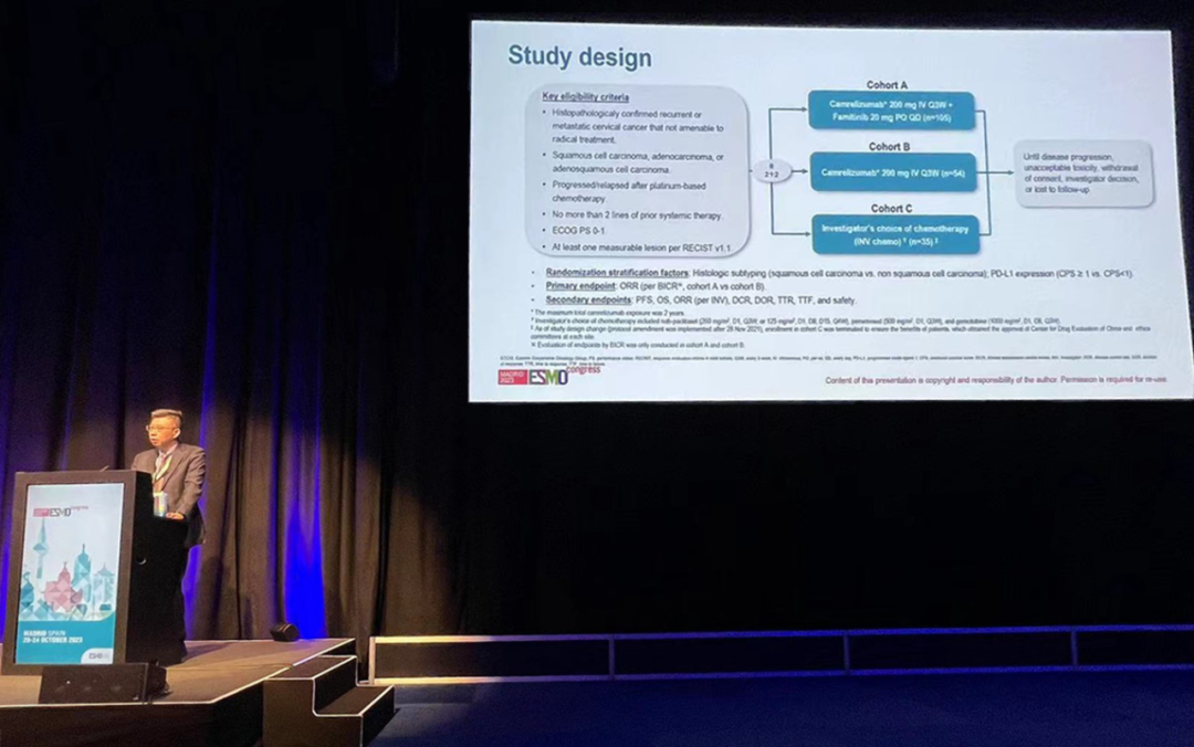 有望为宫颈癌患者带来治疗新选择10月22日,J9九游会医药创新药卡瑞利珠单抗联合法米替尼对比卡瑞利珠单抗单药或研究者选择的化疗治疗复发转移性宫颈癌随机、开放、对照、多中心的Ⅱ期临床研究(SHR-1210-Ⅱ-217) 亮相2023 ESMO大会简短口头报告现场3。该研究由复旦大学附属肿瘤医院吴小华教授团队开展,吴小华教授在现场公布了该重磅研究进展。研究结果显示,在既往以铂为基础化疗失败后复发或转移性宫颈癌患者中,与单独使用卡瑞利珠单抗或研究者选择的化疗相比,卡瑞利珠单抗联合法米替尼显著提高了抗肿瘤活性,安全性可控,有望为晚期宫颈癌患者提供新的治疗选择。