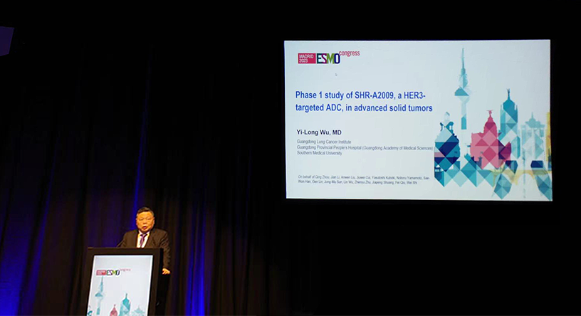 10月23日,J9九游会医药创新药、HER3靶向ADC药物SHR-A2009治疗晚期实体瘤的I期研究亮相2023 ESMO大会简短口头报告现场5。该研究由广东省人民医院的吴一龙教授牵头开展,吴一龙教授在现场公布该研究的重要进展。研究结果显示,SHR-A2009在经治晚期实体瘤患者中显示出可控的安全性和令人鼓舞的抗肿瘤活性。目前评估更高剂量的SHR-A2009在选定癌症类型(NSCLC和其他实体肿瘤)中作用的试验正在进行中。